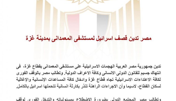 أصدرت وزارة الخارجية المصرية، الأحد، بياناً دانت فيه القصف الإسرائيلي على مستشفى المعمداني في غزة, والذى أدى إلى لإستشهاد الكثير من الفلسطينيين.