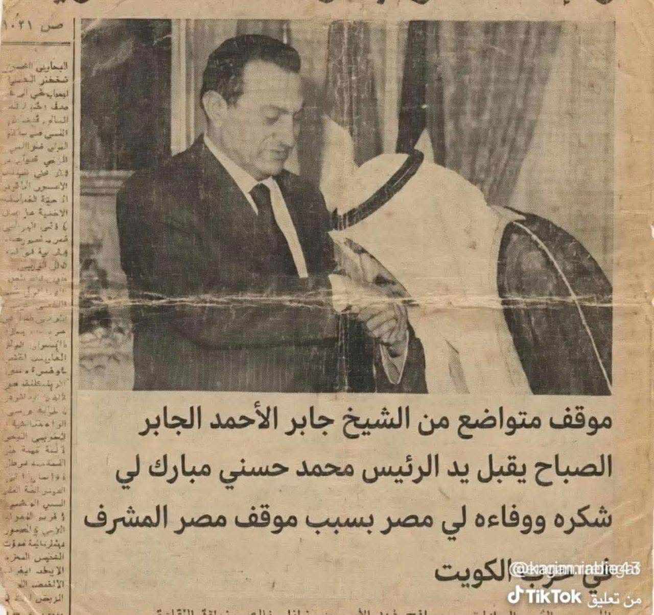 في لحظة تاريخية فارقة، يظهر الشيخ جابر الأحمد الصباح، أمير الكويت الراحل، معبراً عن أسمى آيات الوفاء والتقدير للرئيس المصري الأسبق حسني مبارك، بعد الدور المحوري الذي لعبه الجيش المصري في تحرير الكويت.