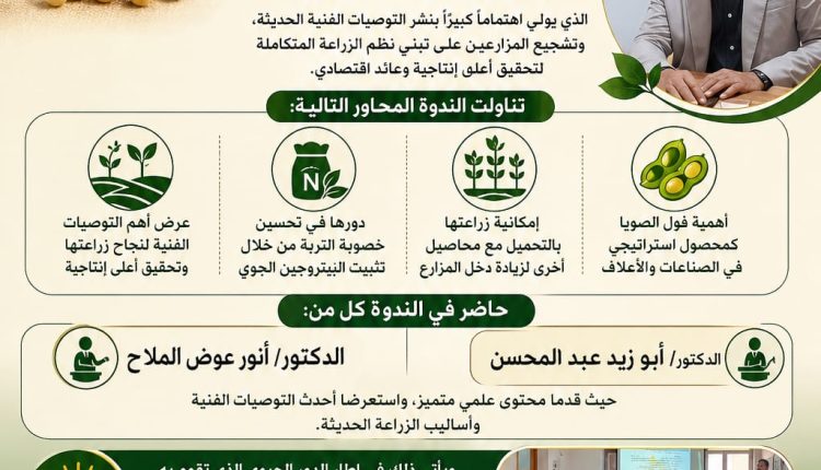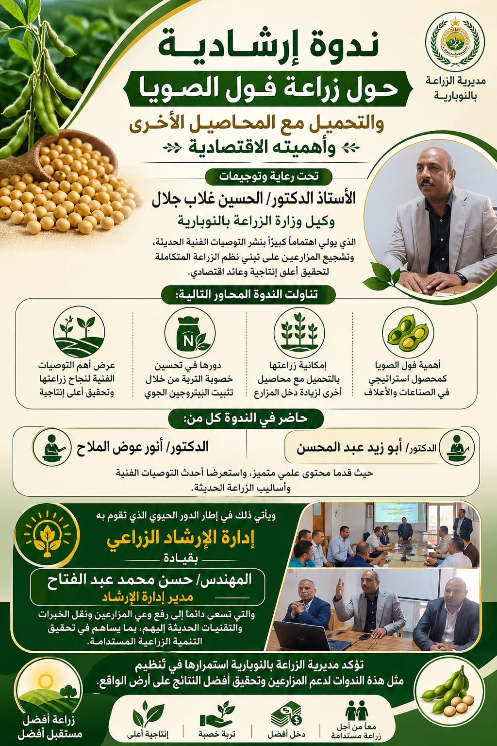 نظمت مديرية الزراعة بالنوبارية ندوة إرشادية موسعة تحت عنوان “زراعة فول الصويا بالتحميل وأهميته الاقتصادية”، وذلك في إطار جهود الدولة للتوسع في المحاصيل الاستراتيجية.